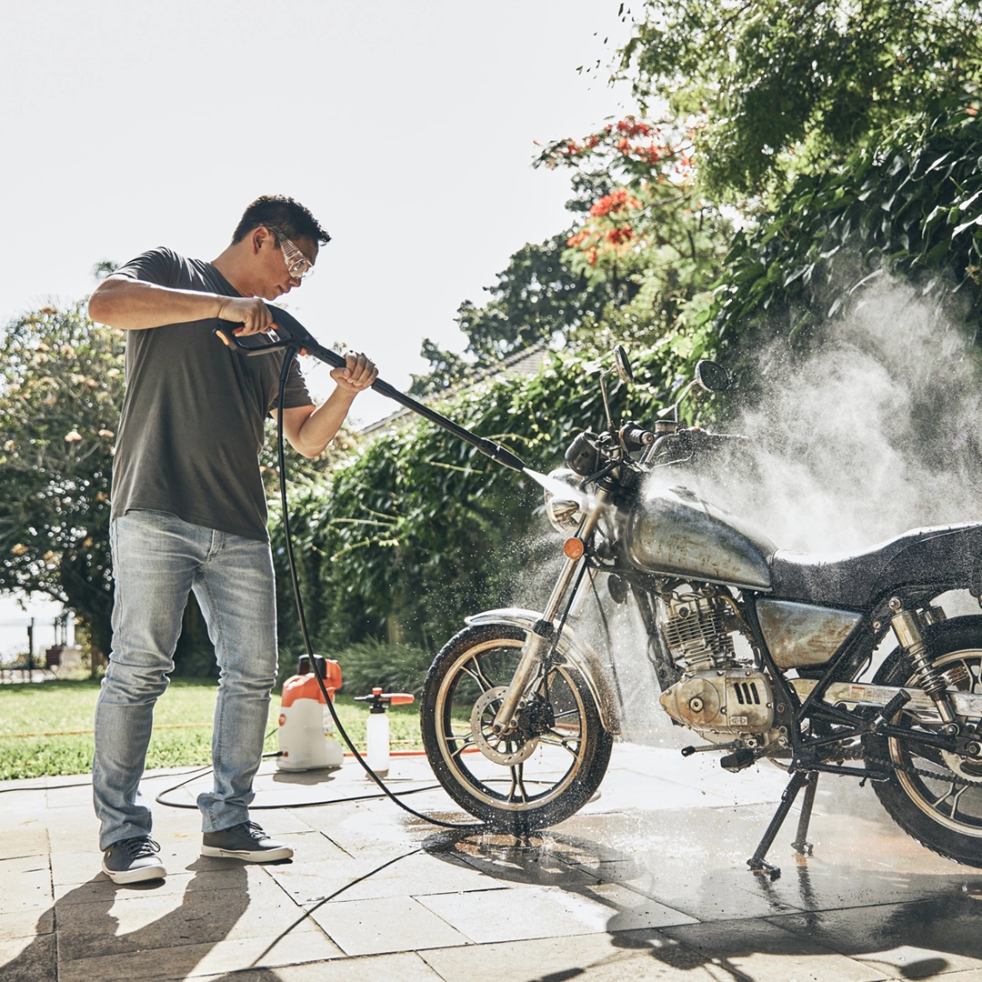 Um dos grandes diferenciais desta lavadora é o carrinho de transporte integrado, que facilita o deslocamento e o armazenamento. Além disso, a pistola de alta pressão é leve e confortável, permitindo que você trabalhe por mais tempo sem esforço. A máquina conta com um cabo de 5 metros e uma mangueira de 6 metros de alta pressão, que proporciona um alcance ideal para qualquer tarefa. A RE 80 X também vem com um bocal turbo, que combina o poder de um jato concentrado com o desempenho de uma ponta rotativa para uma limpeza ainda mais agressiva, e um bocal plano ajustável, perfeito para superfícies mais delicadas.