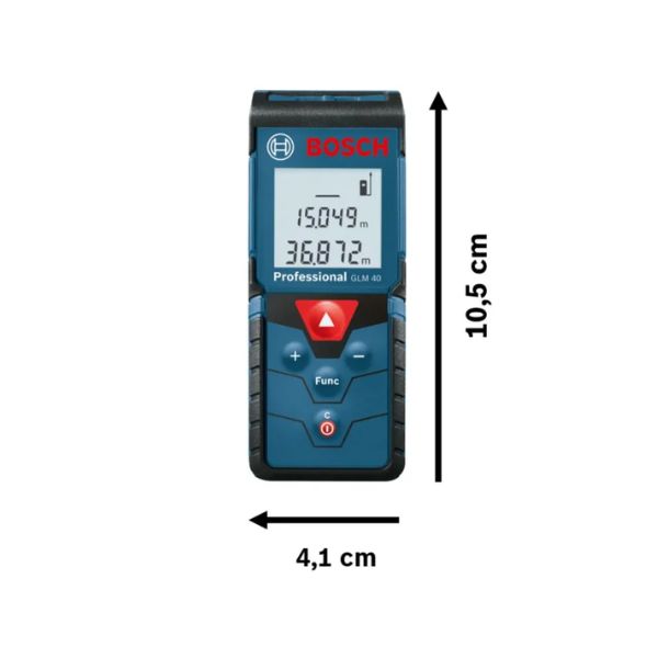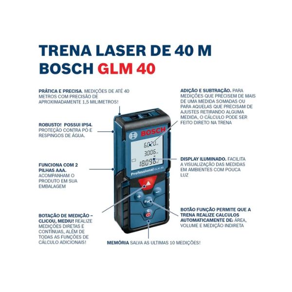 A Trena Laser Bosch GLM 40 é um medidor de distância a laser com alcance de até 40 metros que já realiza funções de calculo: com ele você pode calcular áreas, volumes e até alturas, para medir distâncias você só precisa apontar o laser para o local que deseja medir e pressionar o botão ele também permite realizar medições contínuas: veja o resultado aparecendo na tela em tempo real conforme move a trena, medição de área: meça a largura e o comprimento e o aparelho calcula na hora quantos metros quadrados tem o local, medição de volume: meça a largura, o comprimento, a altura e a trena calcula na hora, quantos metros cúbicos tem o ambiente, medição de altura indireta: calcule facilmente a altura até mesmo de locais que não têm um teto como anteparo. Garantia 2 anos Bosch.